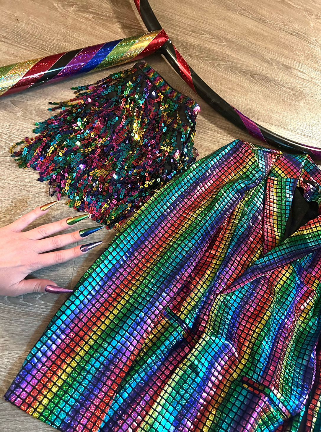 I found this amazing rainbow suit and did my first quick-release pants! I also did my nails and taped my lollipop to match the look.